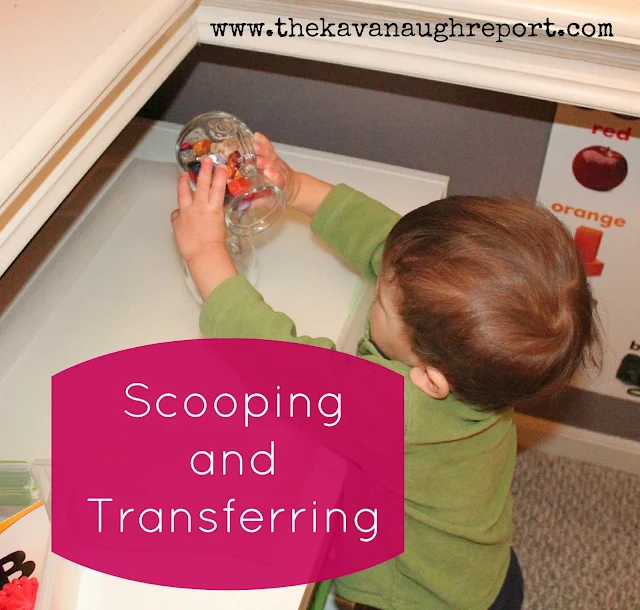 Scooping and Transferring: This is another activity where you really have total freedom. Henry loves to just transfer objects from one container to another. You get to decide the object to transfer and the containers. We've done the glass jars and buttons.
